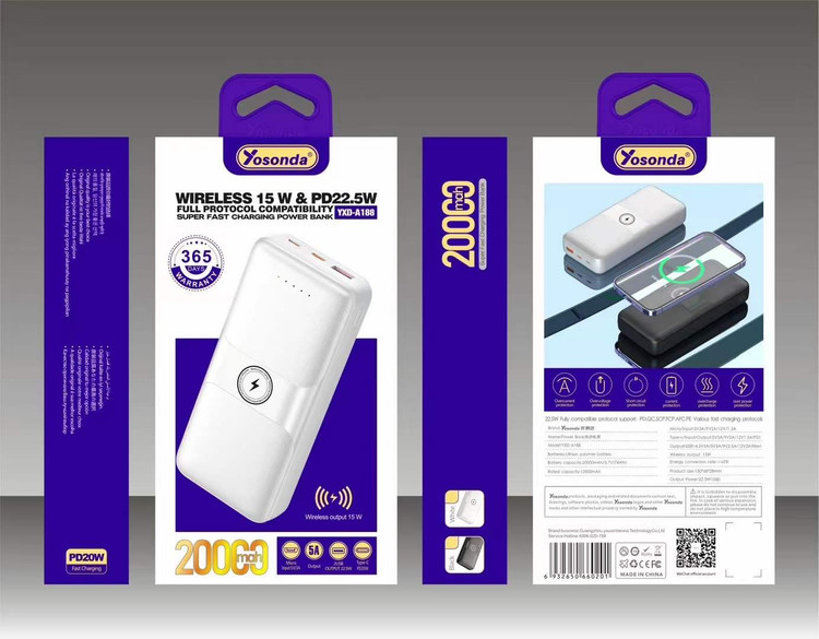 پاور بانک یوسوندا (yosonda) مدل YXD-A188 از سری شارژرهای وایرلس همراه جدید و زیبا میباشد. روی بدنه ی این محصول یک درگاه خروجی pd/USB تعبیه شده که هر دو پورت آن دارای جریان خروجی با شدت 3، 2 و 1.5 آمپر و ولتاژهای 5، 9، 12 ولت نیز فراهم می آورد. همچنین دارای یک درگاه خروجی Type-C میباشد که جریانهای 1.5، 2.5 ،3, 5 آمپر و ولتاژهای 5، 4.5, 9، 12 ولت را فراهم می آورد.. در زمان استفاده از انواع پاوربانکها باید به شدت جریان خروجی آن و دستگاه مورد نظرتان که قرار است باتری آن را شارژ کنید، توجه داشته باشید. در این محصول از یک باتری با ظرفیت 20000 میلیآمپر ساعت بهره گرفتهشده . شرکت تولیدکننده برای روشن یا خاموش کردن این مدل از سری پاوربانکها یک کلید طراحی کردهاست که شما با فشردن آن میتوانید عملیات شارژ باتری دستگاههای خود را آغاز یا تمام کنید. از ویژگی های دیگر این پاوربانک میتوان به حفاظت در برابر تخلیه کامل شارژ، اتصال کوتاه، شارژ بیش از حد پاور اشاره نمود.