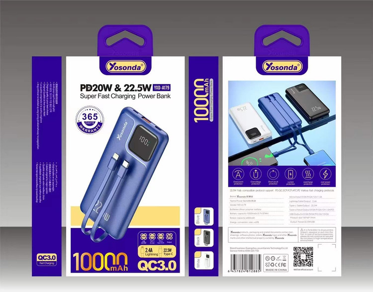 پاور بانک یوسوندا (yosonda) مدل YXD-A179 از سری شارژرهای همراه جدید و زیبا میباشد. دارای یک صفحه LED قابل نمایش جهت درصد شارژ باقی مانده پاوربانک میباشد. روی بدنه ی این محصول دو درگاه خروجی USB تعبیه شده که هر دو پورت آن دارای جریان خروجی با شدت 3، 2 و 1.5 آمپر و ولتاژهای 5، 9، 12 ولت نیز فراهم می آورد. همچنین دارای یک درگاه خروجیpd /Type-C میباشد که جریانهای 1.5، 2.5 ،3, 5 آمپر و ولتاژهای 5، 4.5, 9، 12 ولت را فراهم می آورد. در بسته بندی این محصول یک کابل type-c/pd میباشد. در زمان استفاده از انواع پاوربانکها باید به شدت جریان خروجی آن و دستگاه مورد نظرتان که قرار است باتری آن را شارژ کنید، توجه داشته باشید. در این محصول از یک باتری با ظرفیت 10000 میلیآمپر ساعت بهره گرفتهشده . شرکت تولیدکننده برای روشن یا خاموش کردن این مدل از سری پاوربانکها یک کلید طراحی کردهاست که شما با فشردن آن میتوانید عملیات شارژ باتری دستگاههای خود را آغاز یا تمام کنید. از ویژگی های دیگر این پاوربانک میتوان به حفاظت در برابر تخلیه کامل شارژ، اتصال کوتاه، شارژ بیش از حد پاور اشاره نمود.