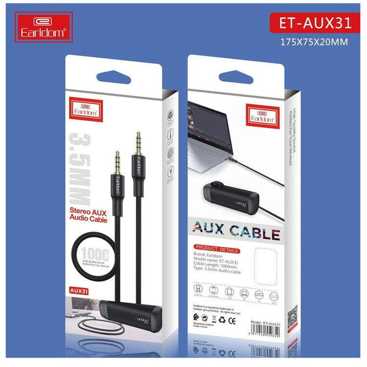 کابل AUX ET-31 محصول شرکت Eerldom است که با فناوری Gold plating process امکان تجربه ی انتقال بسیار سریع صدا و کیفیت بسیار بالای صدا را برای انواع پخش کننده های صوتی و تصویری از جمله تلفن همراه، کامپیوتر، لپ تاپ، ظبط ماشین و... را فراهم می کند. همچنین این کابل با یک روکش پرس شده مقاومت بالایی دارد و این موضوع نگرانی کاربران را در مورد پاره شدن و قطعی سیم را تا حدودی برطرف میکند