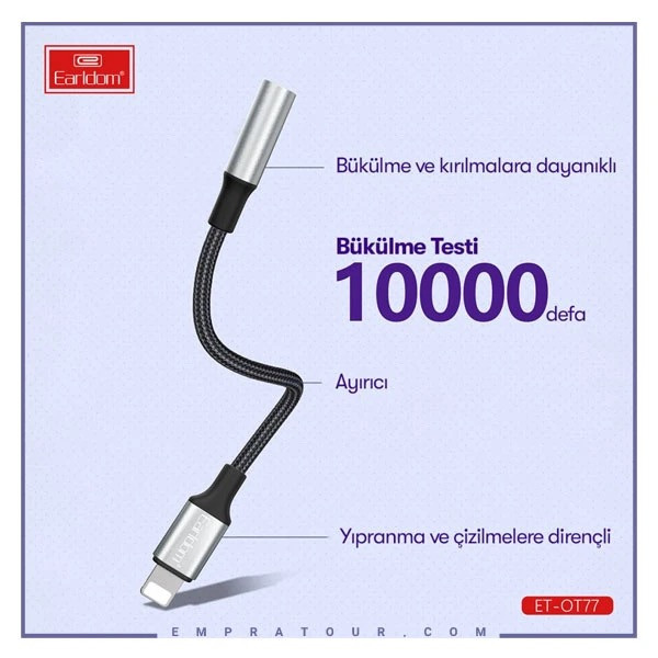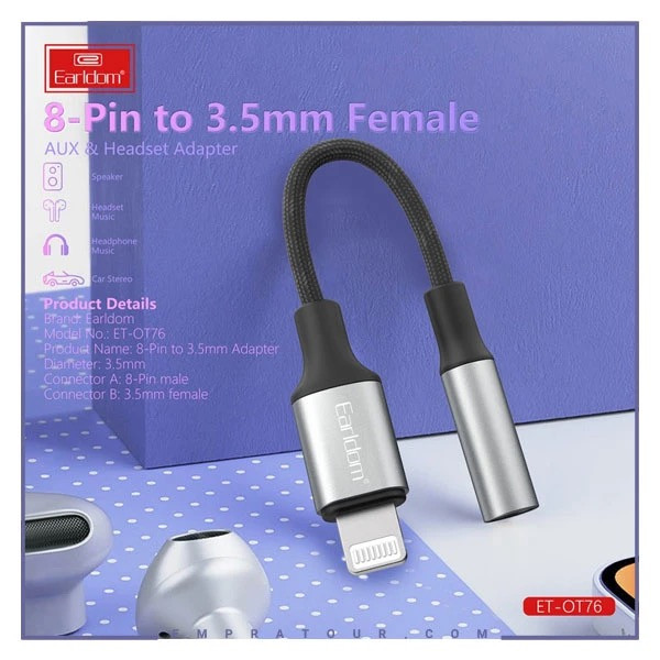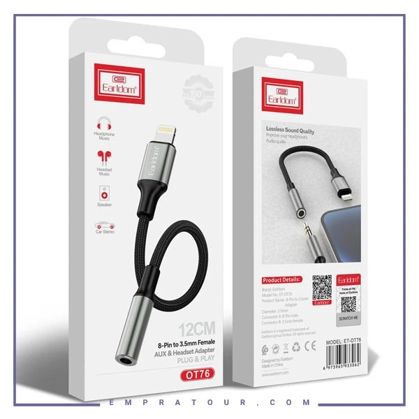 مبدل لایتنینگ به جک ۳.۵ میلی متری ارلدام مدل ET-OT۷۶ مبدل Lightning به جک ۳.۵ میلیمتر برای دارندگان گوشیهای موبایل و تبلت اپل که فاقد AUX هستند. روکش کابل از تارهای به هم بافته شده از جنس Braided، بسیار مقاوم در برابر خمش، کشش گرهخوردگی و پارگی دارای سوکتهای فلزی ضد زنگ از جنس آلیاژ آلومینیوم، مقاوم در برابر سایش و خوردگی سبک و کم حجم با قابلیت استفاده راحت و حمل آسان به هر مکانی با طول ۱۲ سانتیمتر و عرض تنها ۱۰ میلیمتر سازگار با اکثر گوشیهای هوشمند دارای پورت Lightning و بدون خروجی جک ۳.۵ ميلیمتری مناسب محصولات اپل فاقد پورت صدا (AUX) برای گوش دادن به موسیقی و اتصال انواع هدفونها، اسپیکرها و دیگر دستگاههای پخش کننده مجهز به ورودی صدا به دستگاههای دارای درگاه لایتنینگ