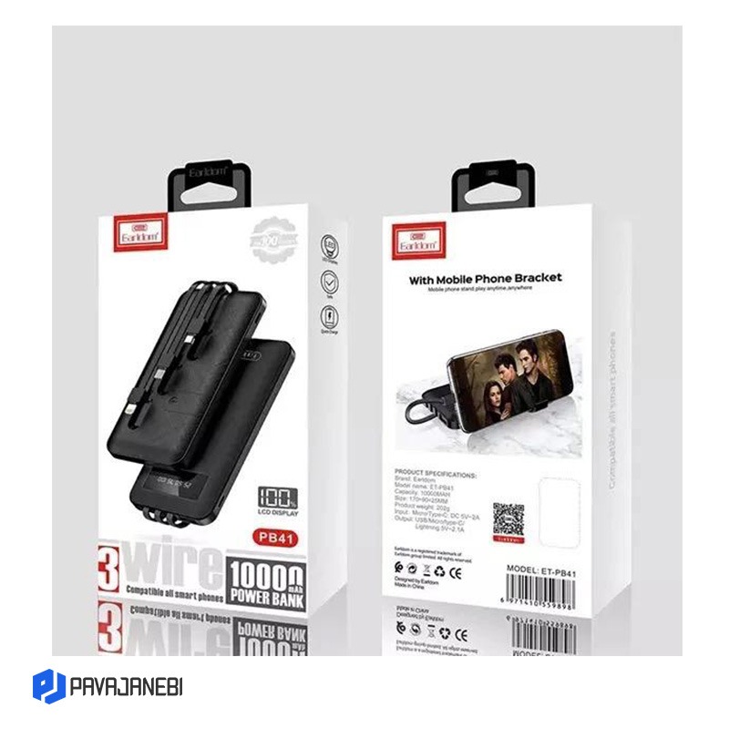 پاوربانک 10000 ارلدام مدل ET-PB41 از جمله محصولات ارلدام با کیفیت ساخت بالا است که امکانات ویژهای را ارائه میدهد. با داشتن 3 کابل متصل از نوع میکرو، لایتنینگ و تایپ سی، نیازی به کابل اضافه نخواهید داشت. میزان شارژ باقی مانده را میتوانید با کمک نمایشگر مشاهده کنید. همچنین این پاوربانک 10000 میلی آمپری دارای دکمهی خاموش و روشن نیز است.