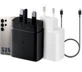 شارژر سوپر فست اورجینال سامسونگ گلکسی S25 Ultra از یک آداپتور 45 وات و یک کابل تبدیل دو سر تایپ سی تشکیل شده است. این شارژر دیواری دارای نسخههای متفاوتی با توجه به پارت نامبر یا همان سفارش کشورهای مصرف کننده میباشد به همین علت این شارژر در بعضی مدلها به صورت دوشاخه طراحی شده و در بعضی دیگر سه شاخه که نیاز به مبدل دوشاخه است تا بتوانید آن را به پریز برق متصل نمایید.